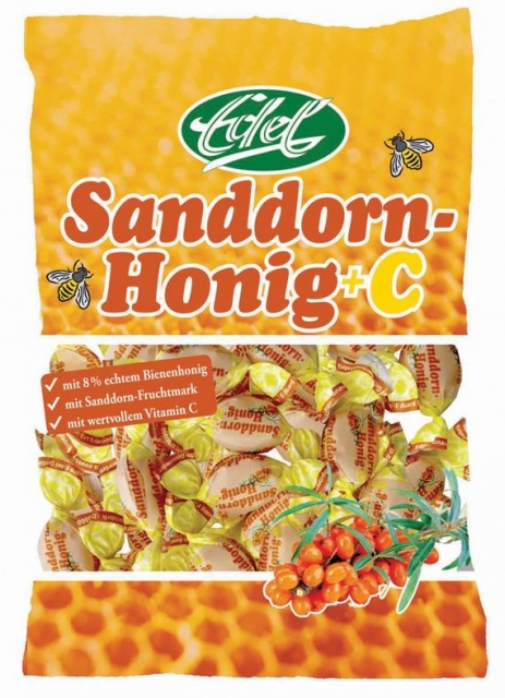 Zutaten: Glukosesirup, Zucker, Honig (8,6%), Sanddorn-Fruchtmarkpulver 0,3% (getrocknetes Sanddorn-Mark, Maltodextrin), Vitamin C, natürliches Aroma, Säuerungsmittel Citronensäure, Karottenkonzentrat.