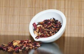 Hibiskusblüten, Hagebuttenschalen, Apfelstücke, Holunderbeeren, Orangenschalen, Aroma.