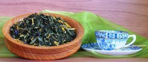Grüner Tee, Aprikosenstücke, Malvenblüten blau, Ringelblumenblüten, Aroma.